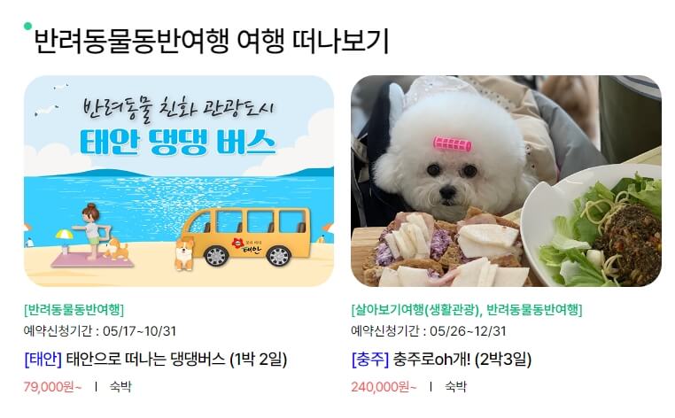 반려견과 여행 가기가 쉽지 않은데 이렇게 반려견과 함께 할 수 있는 여행 패키지도 있습니다