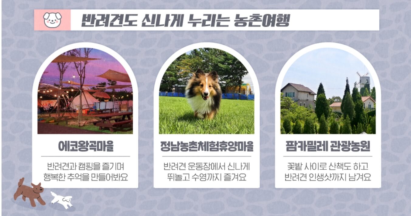 아이들이나 반려견과 체험할 수 있는 농촌여행의 테마가 인상적이며 좋을 추억을 만들 수 있을 것 같아 예시로 가지고 왔습니다