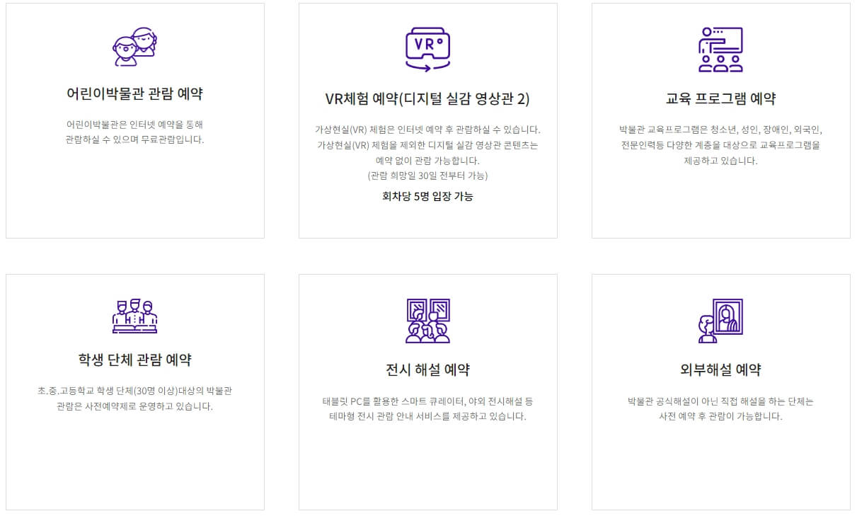 VR체험이나, 전시 해설, 교육프로그램, 학생 단체(30명 이상) 등은 사전 예약을 해야 체험 관람이 가능합니다