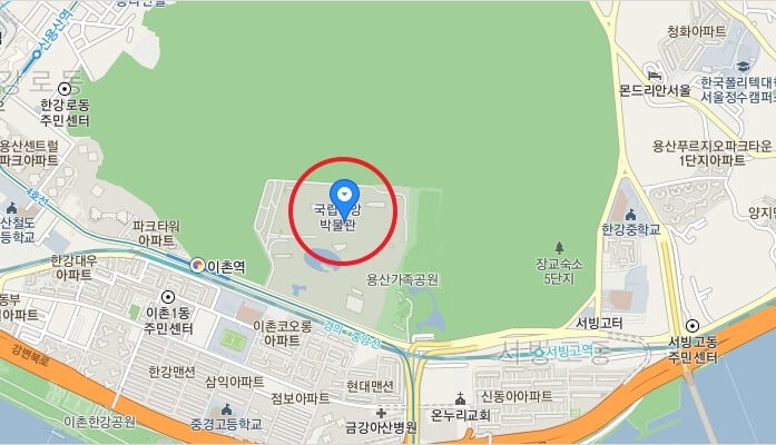 강남 방면:반포대교에서 첫 번째 삼거리에서 용산가족공원 방향으로 좌회전하고, 용산가족공원 입구에서 약 300m가량 직진하면 국립중앙박물관에 도착합니다