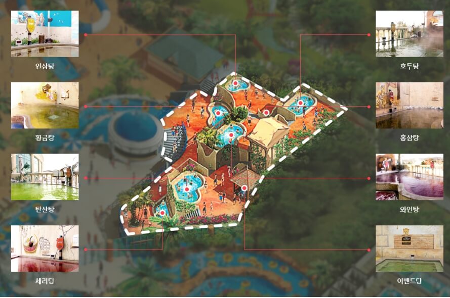 이벤트 탕 종류로는 고혈압과 두통에 효력 있는 황금탕, 체리탕, 탄산탕, 홍삼탕, 눈을 맑게 해 주고 몸이 가벼워지도록 도움을 주는 인삼탕, 보습 효과의 와인 탕, 피부 개선에 좋은 호두 탕 등이 있습니다