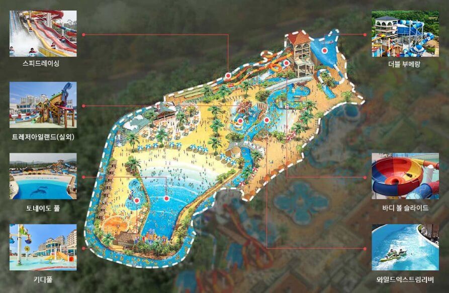 로마, 베니스, 스페인 등 유럽 건축물과 유적지 수풀을 배경으로 해서 워터파크 공간으로 구성되었으며 급류 유수 풀은(와일드 익스트림 리버) 371m로 국내 최장 길이입니다